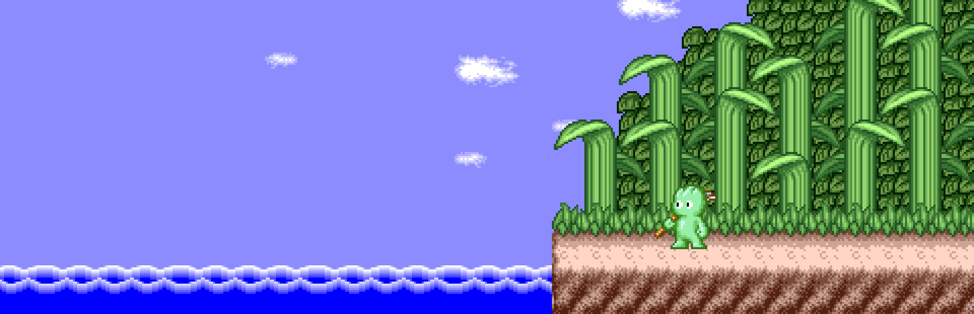 Va equipado con un tridente y da saltos normales y también especiales. El juego fácil no es en absoluto, sobre todo para medir saltos y defenderse de ciertos enemigos. Pero escuchar la música fase tras fase merece la pena. O ya que estás aquí, no hace falta que lo juegues, ve directo al reproductor más abajo y disfruta.
